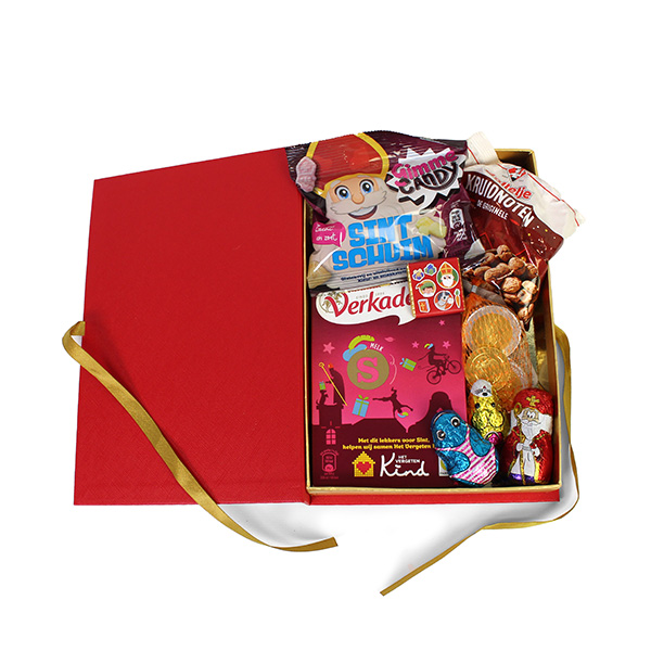Inhoud | Bolletje kruidnoten (50 gram), een Verkade S-reep (65 gram), holfiguur Sint van melkchocolade, Sintschuim van Gimme Candy, een kikker en muis van chocolade, netje chocolade munten en chocolade met Sintwikkel |