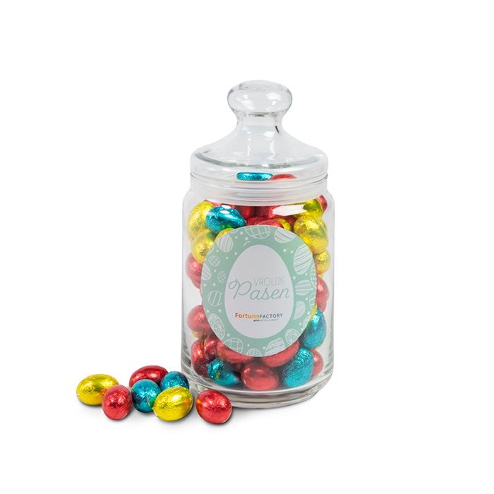 Deze medium stolp met paaseitjes heeft een inhoud van 1 liter, die wij vullen met ca. 700 gram massieve chocolade paaseitjes. Het is ook mogelijk om de stolp te vullen met paaseitjes in een bepaalde kleur. Op deze manier kan je de stolp aanpassen op de huisstijl van het bedrijf. Als je de paaseitjes in een bepaalde kleur wilt hebben, vraag dan hierboven een offerte aan.