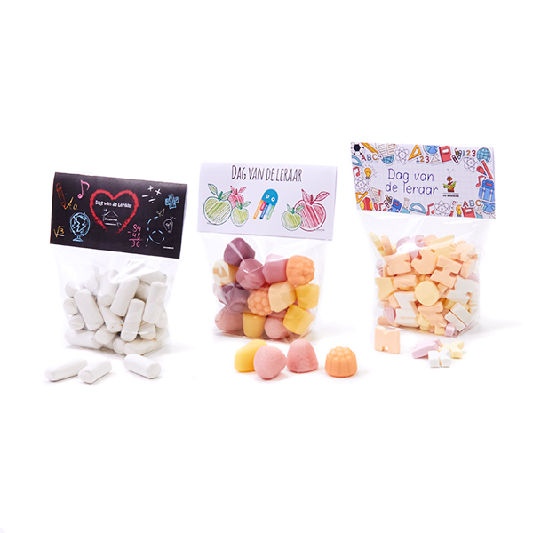 Bedank jouw collega's en personeel voor hun inzet en schenk een speciaal zakje snoep voor de leraar. Je kunt de zakjes vullen met snoep naar keuze: schoolkrijt, yoghurtgums en vruchtenhartjes. De snoepjes worden in een transparant zakje verpakt, en afgesloten met een topkaartje.